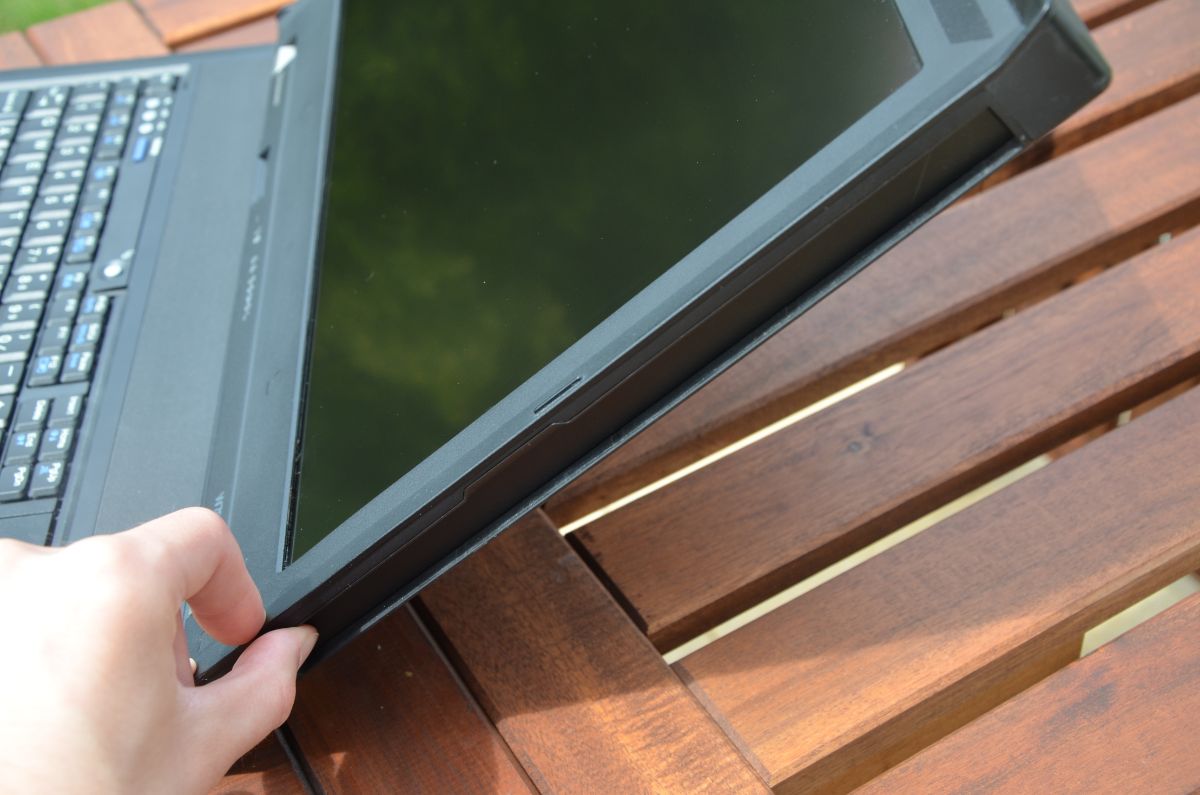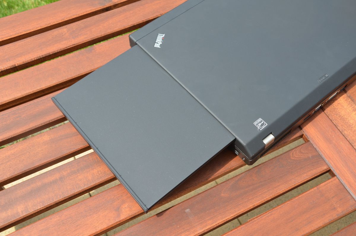 Na první pohled každého zaskočí rozměry celého zařízení. 41 cm šířky a 31 mm délky by ještě nepředstavovalo nic monstrózního. Díky atypicky skosené zadní straně je ale markantní hlavně tloušťka: 5,1 cm je něco, s čím se v dnešní módě tenkých ultrabooků nesetkáme. Víko je tradičně pogumované, díky vnitřnímu rámu Rollcage také velmi pevné. Na horní straně víka se nachází ještě plastová lišta, která se ale na některých ThinkPadech ráda lámala. Tady nemám o její životnost strach, působí velice pevným dojmem a o její ulomení bych se vůbec nebál. Zařízení působí v ruce velice pevným dojmem, přirovnal bych jej k monolitu či cihle (ostatně, pokud vám ThinkPad W700ds upadne na nohu, výsledný efekt bude stejný). Víko je v zavřeném stavu jištěné mechanickým zámkem (žádné magnety). Notebook je možné otevřít jednou rukou, v 90° se ale začne základna zvedat a je nutné ji přidržet. Panty dovolují vyklopit víko do úhlu ca. 115° (omezení je dané velkou tloušťkou víka).