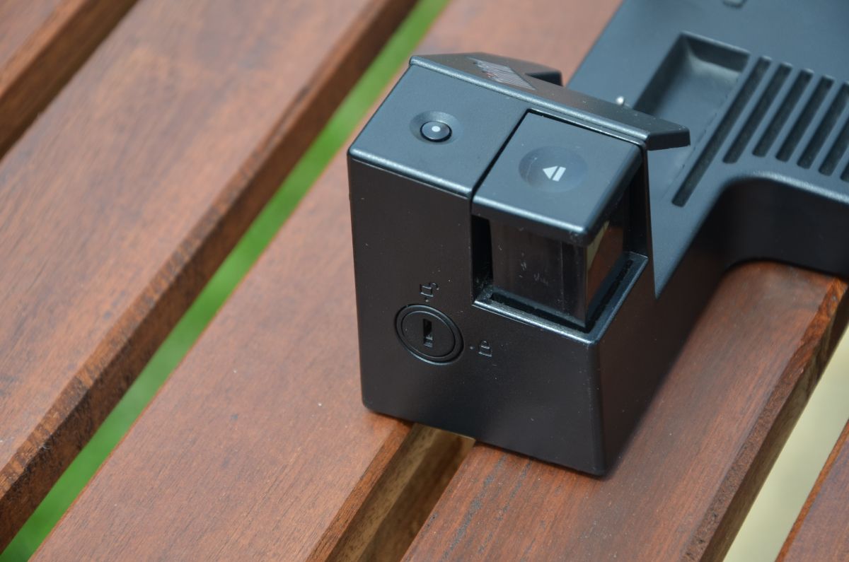 Notebook lze v kanceláři samozřejmě zabezpečit proti krádeži: přímo na doku se nachází zdířka pro zámek kensington, laptop lze pak v doku zamknout pomocí speciálních klíčů.
