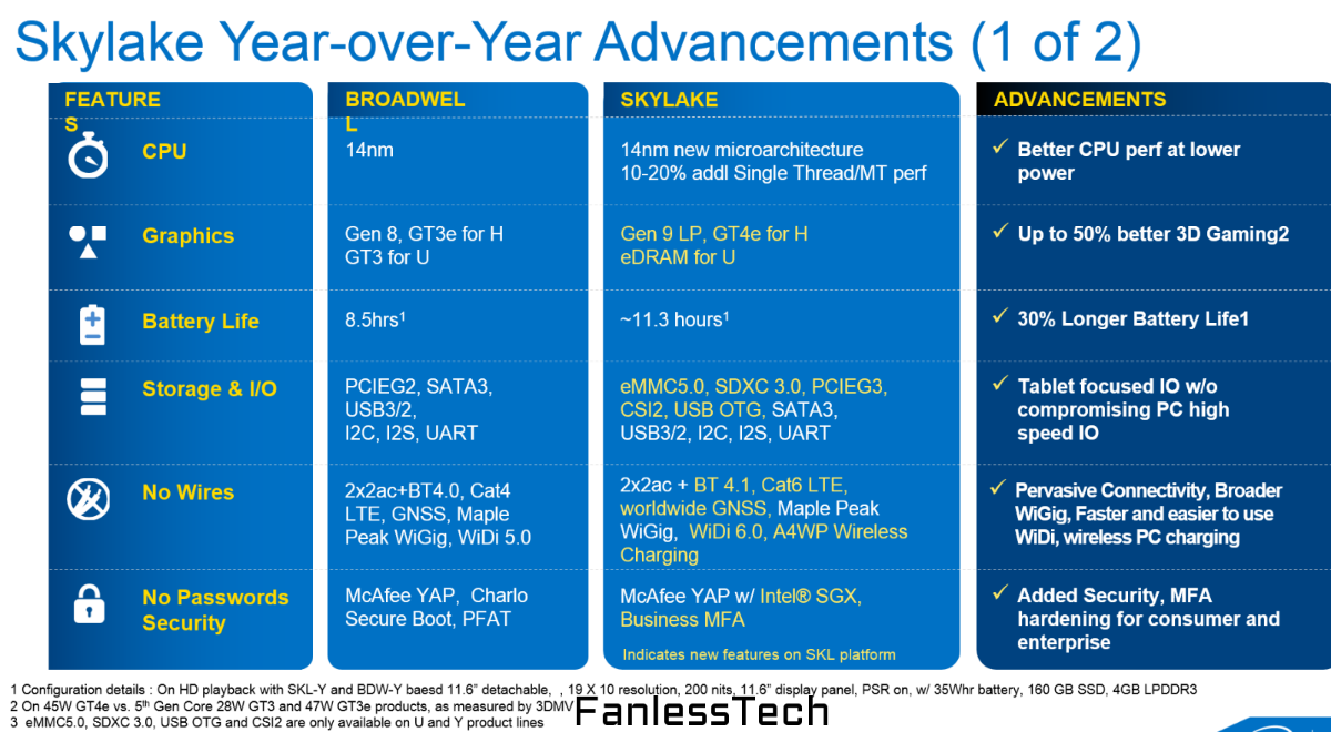 - nová grafická architektúra („Gen 9 LP“), štvorjadrové H s novou variantou GT4e s 72 CU oproti 48 v Broadwell, zvýšenie výkonu neminie ani dvojjadrové U vďaka eDRAM