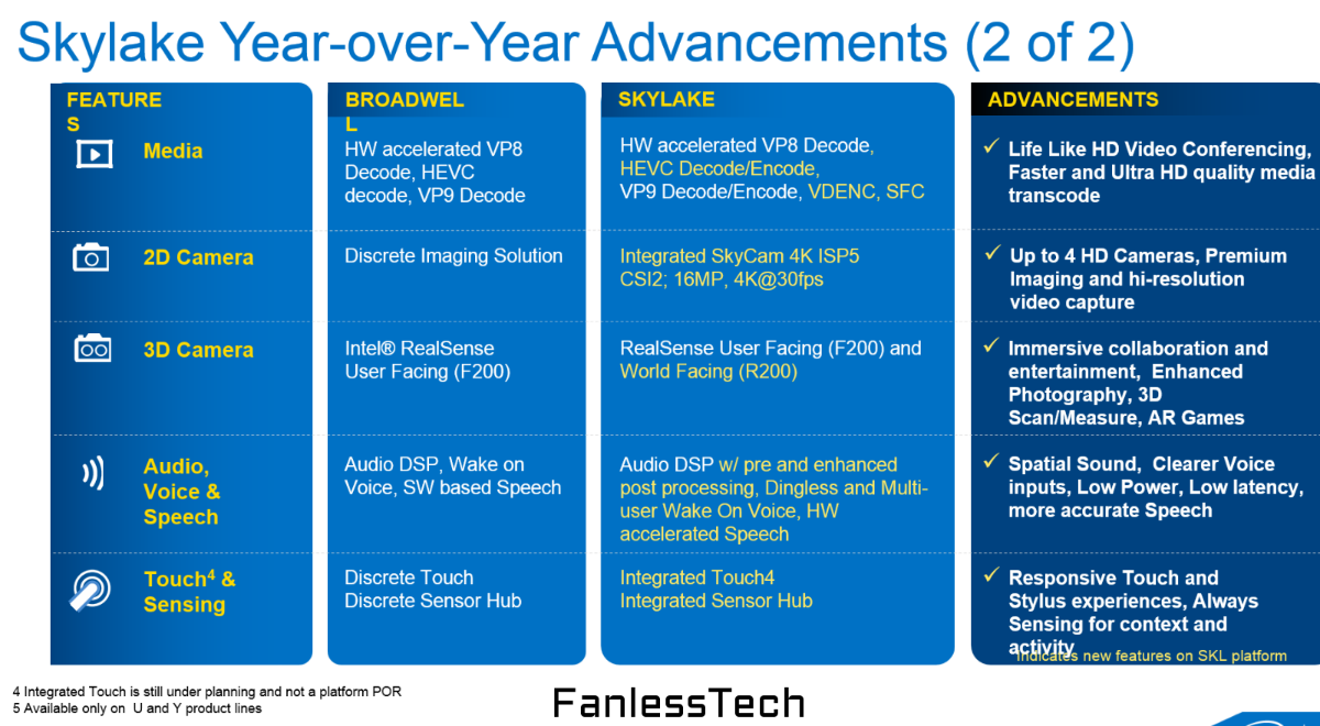 - dvojjadrové Y a U získajú radič PCI Express 3.0 (oproti 2.0 v Broadwell/Haswell), eMMC 5.0, rozhranie SDXC 3.0 a podporu USB OTG