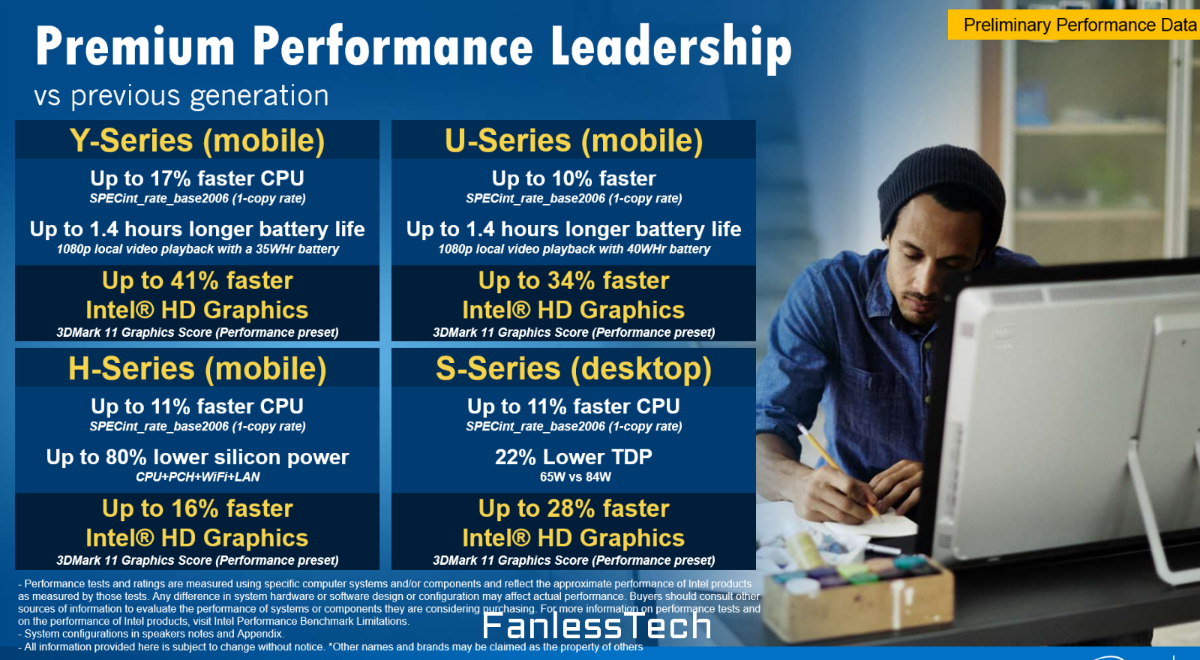 Na treťom a poslednom slide vidíme zhrnuté výsledky testov CPU a GPU. Výkon procesora je testovaný pomocou testu SPECint_rate_base2006 a výkon grafiky pomocou 3DMark 11. Desktopové procesory rady S majú mať o 11 % rýchlejší CPU a o 28 % rýchlejší GPU. Výsledky testov u mobilných procesorov sú u rady Y a U veľmi podobné. CPU procesorov rady U pocítia zvýšenie o 10%, u rady Y dôjde k zvýšeniu o 17 %, pričom u oboch rad sa má výdrž zvýšiť o 1,4 hodiny. GPU rady U má byť o 34 % rýchlejšia, integrovaná grafika rady Y zvýši svoju rýchlosť o 41 %. Najnižší nárast GPU vidíme u rady H, len o 16 %, ani nárast CPU nie je nijak výrazný, jeho rýchlosť sa zvýši o 11 %.