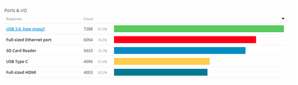 Dnes se podíváme na klíčová zjištění z průzkumu 3, která s vámi mohu sdílet. Vysokovýkonný procesor se těší velké přízni, ovšem rozchází se názory na to, zda má být dvou-, nebo čtyřjádrový. Náš produktově marketingový tým bude muset tento oříšek rozlousknout. Velmi nízké preference má mechanický HDD, lví podíl preferencí zde patří výkonným SSD diskům. Upřímně nejsem překvapen. Volba konektorů je náročným tématem s mnoha možnostmi, které je třeba rozklíčovat. USB je na první příčce se čtečkou SD karet, která se umístila výše, než jsme čekali. Část tabulky nejlepších 5 portů najdete níže.