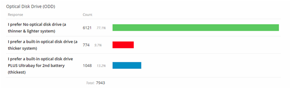 Zpětná vazba ohledně optické mechaniky a zřejmá repríza UltraBay je také zajímavé téma. Převážná většina nevyžaduje žádnou z těchto funkcí. Přestože já jsem funkce UltraBay plně využíval, její užitečnost je asi už pasé. Níže tabulka o preferencích optické mechaniky a UltraBay.