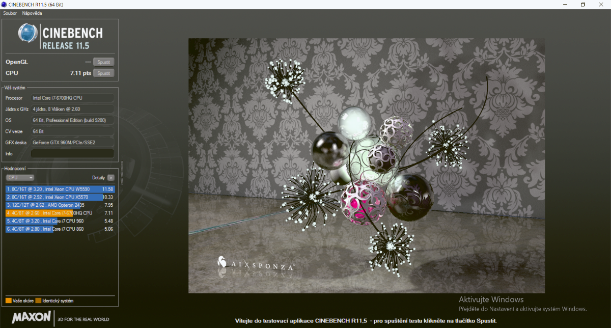Dále 7,11 bodů v Cinebenchi R11,5 značí, že CPU není žádné ořezávatko. Zde naleznete výsledky z 3DMarku.