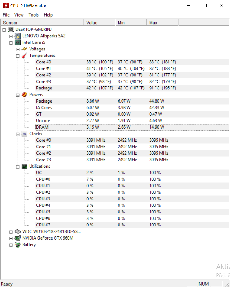 …se snaží nesmyslně chladit na 35°C. Kdyby nový BIOS / finální produkt posunul tuto hranici na 55°C, bylo by to super, protože by se notebook po dlouhou dobu chladil pasivně. Co jsem vypozoroval, má ventilátor jen tři stupně otáček – vypnut/střední otáčky/vysoké otáčky. Dle mého je tu šance, že finální produkt bude mít více stupňů, a bude tak mít příjemnější projev. Projev je příjemný, nejedná se o žádný extremně hlučný ani pištivý či vysokofrekvenční zvuk. Teploty jsou velmi příjemné, abych byl upřímný, čekal bych je mnohem horší… Ono CPU na jádře pod 90°C docela chválím.