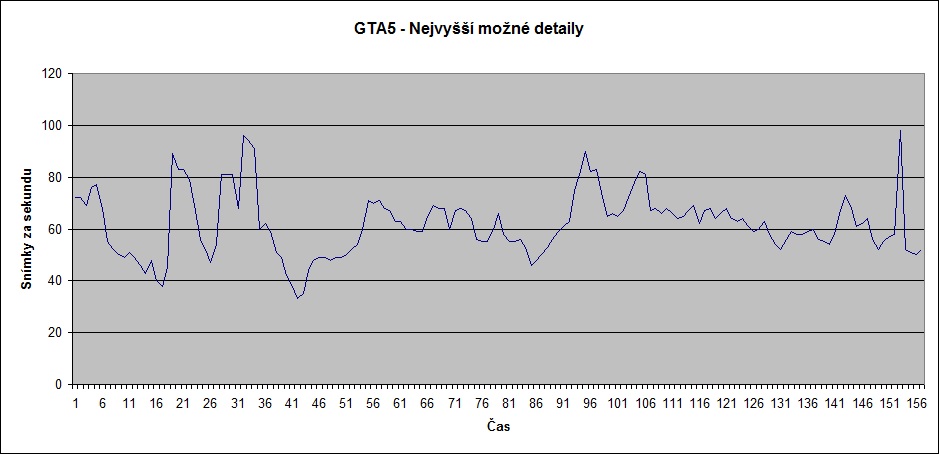 Min:33, Max:98, Avg:61,8 Dle grafu je vidět, že hra nikdy během benchmarku neklesla pod 30 snímků za sekundu. Je důležité vzít v potaz, že nastavení hry je nevyšší možné, včetně pokročilých nastavení stínů, postprocess efektů.