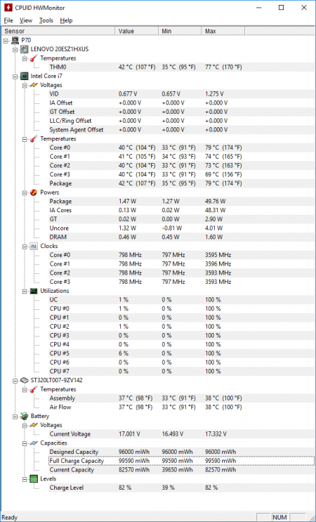 Notebook obsahuje opravdu výkonné čtyřjádrové procesory a grafické karty, které opravdu umí „zatopit“. Naštěstí má chlazení opravdu vynikající a zároveň tiché. Primární zásluhu na tom přikládám „tloušťce“ notebooku a dvěma ventilátorům. Právě ona tloušťka notebooku, která bude většině uživatelů velmi nepříjemná, podle mě dovolila návrhářům osadit do notebooku opravdu účinné, ale cenově přiměřené chlazení, které jednak účinně chladí a druhak není nepříjemně hlučné. Vzhledem k tomu, že jsem měl v konfiguraci nejslabší možnou grafickou kartu, tak nedokáži říci, jestli takto nehlučný a chladný bude i ThinkPad P70 s grafickou kartou Nvidia Quadro M5000M, který bude tepla vydávat mnohem víc. Věřím ale, že by to neměl být problém, protože ventilátory jsou i při nejvyšších otáčkách velmi tiché – pouze vzdáleně šumí.