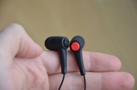 Již z produktových fotografií mě sluchátka okouzlila svým zajímavým designem. Černé provedení by samo o sobě nebylo nijak zajímavé, červeně provedení pravého sluchátka ale celý výrobek okamžitě zařazuje do zbytku rodiny ThinkPad. Povrchová úprava obou modulů reproduktorků připomíná typická pogumovaná víka notebooků ThinkPad, ve skutečnosti jde ale pouze o plast. Zpracování je velice solidní, sluchátka rozhodně nepůsobí křehkým dojmem. Nebál bych se říct, že pád na zem jim nebude dělat žádný problém. Reproduktorky patří k těm větším, určitě nejde o nenápadná sluchátka. Komu by sluchátka nedržela v uších, může si vybrat ze dvou párů náhradních gumových nástavců v různých velikostech.