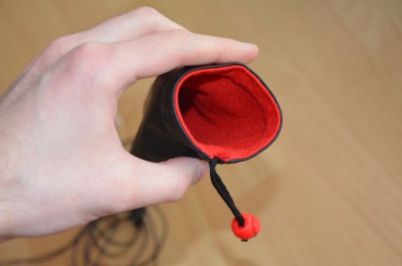 Druhou drobností v prodejním balení je dvoubarevný textilní sáček na uložení sluchátek. Ačkoliv to tak výrobce pravděpodobně asi nezamýšlel, právě sáček je to, co mě z celé sady zaujalo právě nejvíce. Materiál na vnější straně má černé, polomatné provedení trochu připomínající softshell. Samozřejmostí je logo ThinkPad, umístěné přesně tam, kde bychom ho očekávali. Vnitřní strana pytlíčku je z červené textilie. V horní části pytlíčku je vpletena tkanička s poutkem, aby sluchátka nemohla vypadnout. Moc pěkný bonus, čímž si podle mě výrobce alespoň trochu opodstatňuje cenu, sáček totiž s ThinkPadem výborně ladí.