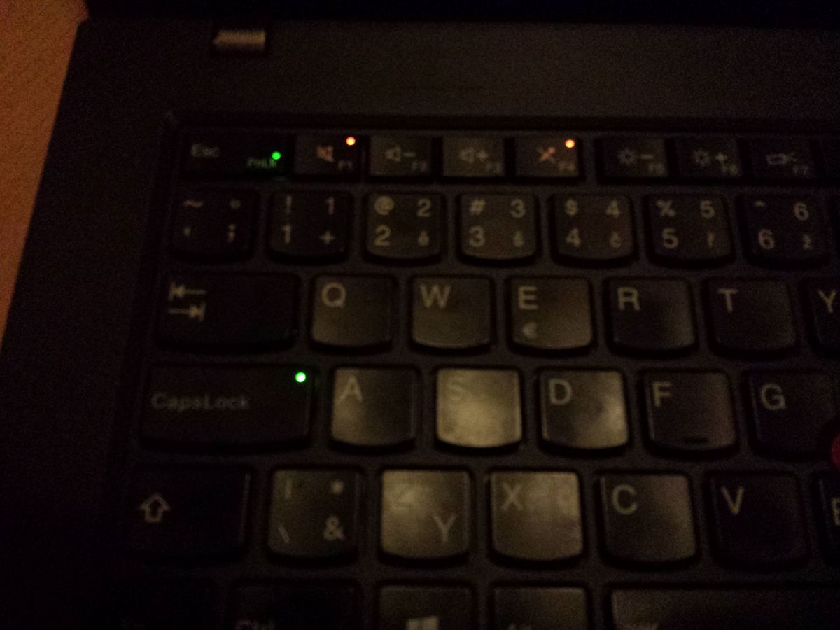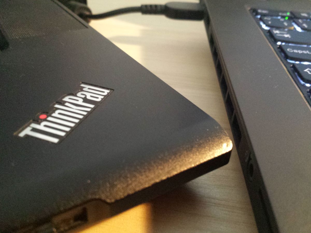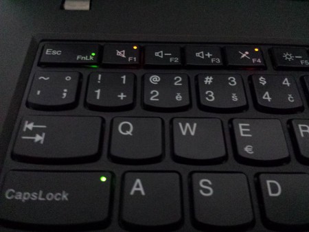 Obecně mě asi nejvíce mrzí absence indikačních diod. Od dob, kdy jsou v noteboocích SSD disky, tak vcelku dokáži žít bez diody indikující práci disku, ale nějaké ty diody pro činnost Wi-Fi a různé stavy napájení bych opravdu uvítal. Přece jen tu nějaké jsou, ale považuji je za poměrně nešťastně řešené – dioda indikující vypnutý, nebo uspaný stav notebooku je červená tečka nad nápisem ThinkPad na víku displeje. Povrch víka displeje je z (pro poslední tři generace) typického pogumovaného povrch. Další diodu, která nám napoví připojení nabíječky (blikání), nabíjení (oranžová barva) a nabito (zelená barva) je u napájecího konektoru. Poslední indikační diodu nalezneme integrované v tlačítkách (CapsLock, F1, F4, FnLk) indukující stav příslušné funkce.