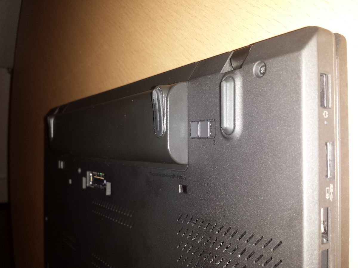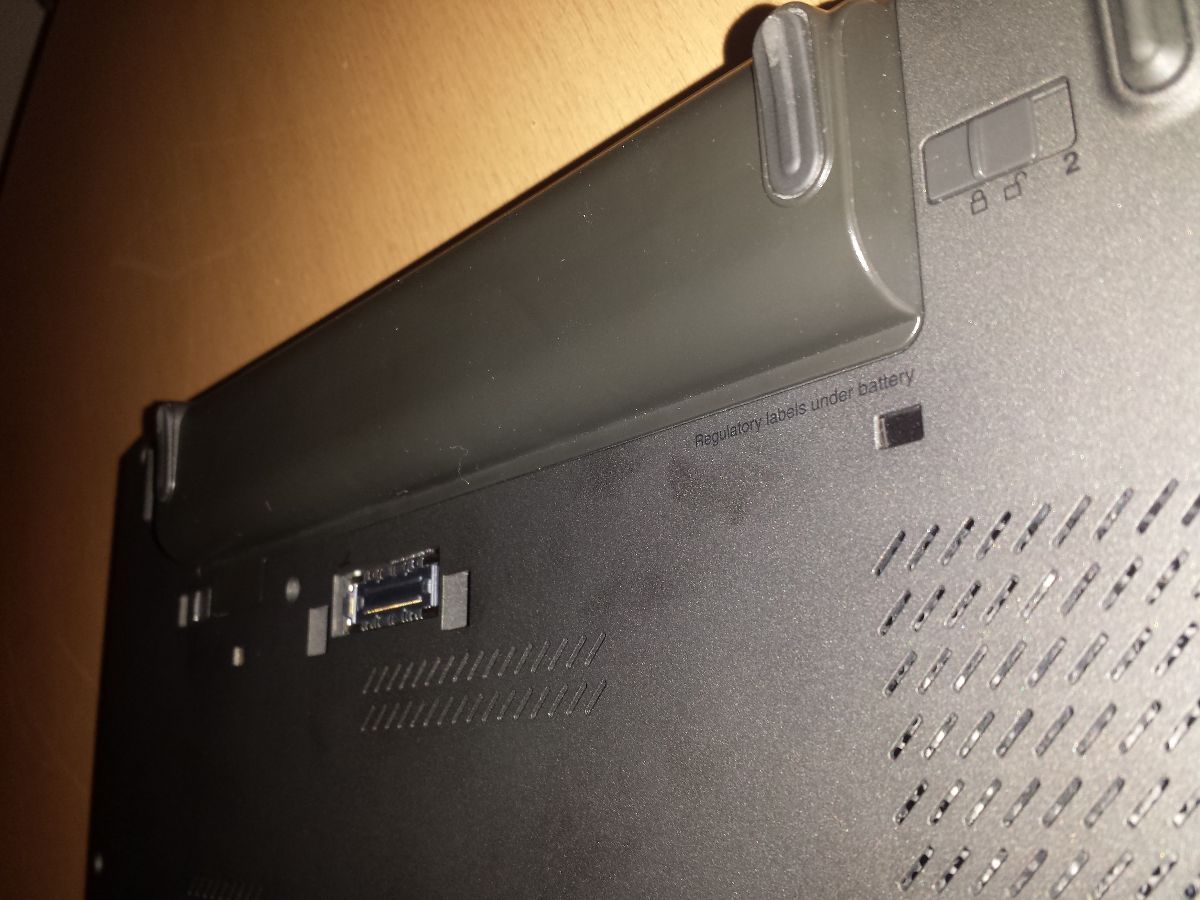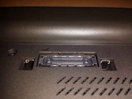 Spodní strana notebooku je poměrně jednolitá. Zaujme snad jen viditelné zapuštění dokovacího konektoru, což je právě ten rozdíl v „tloušťce“ od standardní T460 a také baterie s vyšší kapacitou. Po vzhledové stránce se jinak jedná o nijak vyčnívající notebook z dnešní vzhledové diktatury.