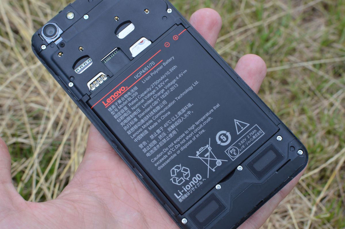 Když jsme u zadní části telefonu, pojďme si ji blíže popsat. V levém horním rohu nalezneme čočku fotoaparátu a jednobarevnou přisvětlovací LED diodu. Pod fotoaparátem se nachází mikrofon, který využijete při natáčení. Na spodní straně se pak nachází dvojice stereo reproduktorů Dolby Atmos, které známe například z loňského modelu Lenovo A7000. Kryt se o něco hůře sundává, za to však nikde nic nevrže. Pod krytem se nahází baterie, která jde z telefonu taktéž hůře vyndat. Sundáním baterie se dostaneme k dvojici slotů pro SIM karty a jednomu slotu pro MicroSD kartu. LTE funguje pouze ve slotu s číslem 1 (tedy v tom na pravé straně) a paměťové karty jsou podporovány do velikosti 32GB. Testovaný model byl tedy v provedení DualSIM, existuje však i SingleSIM varianta.