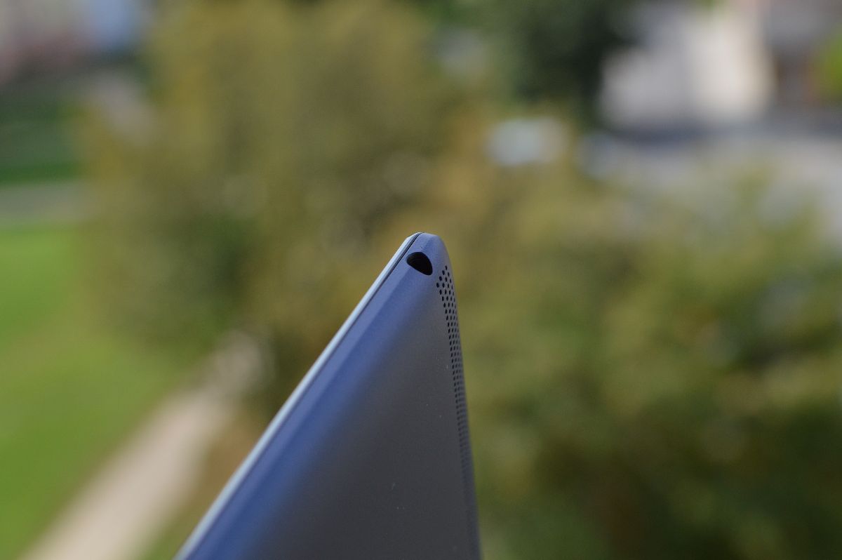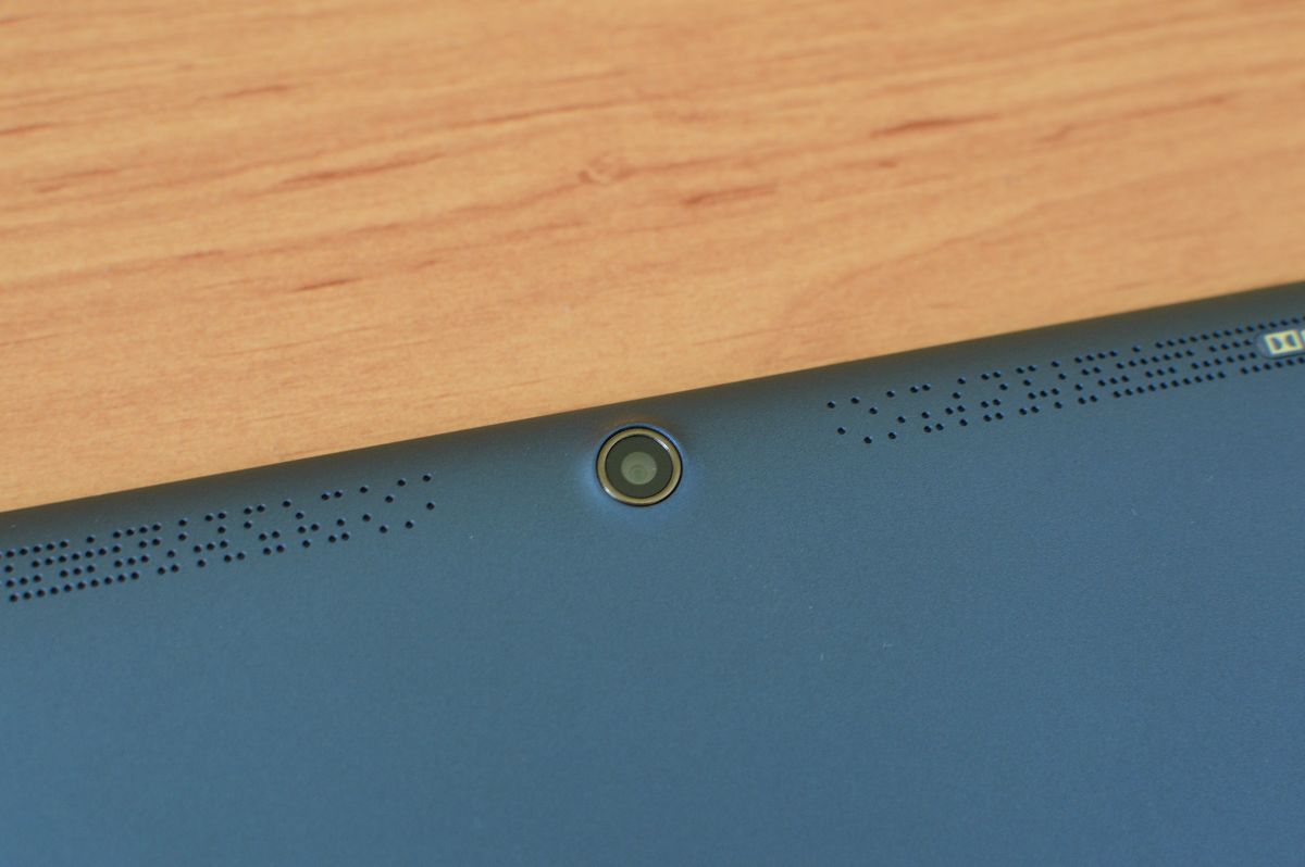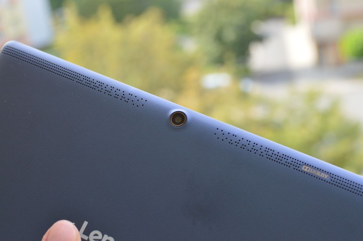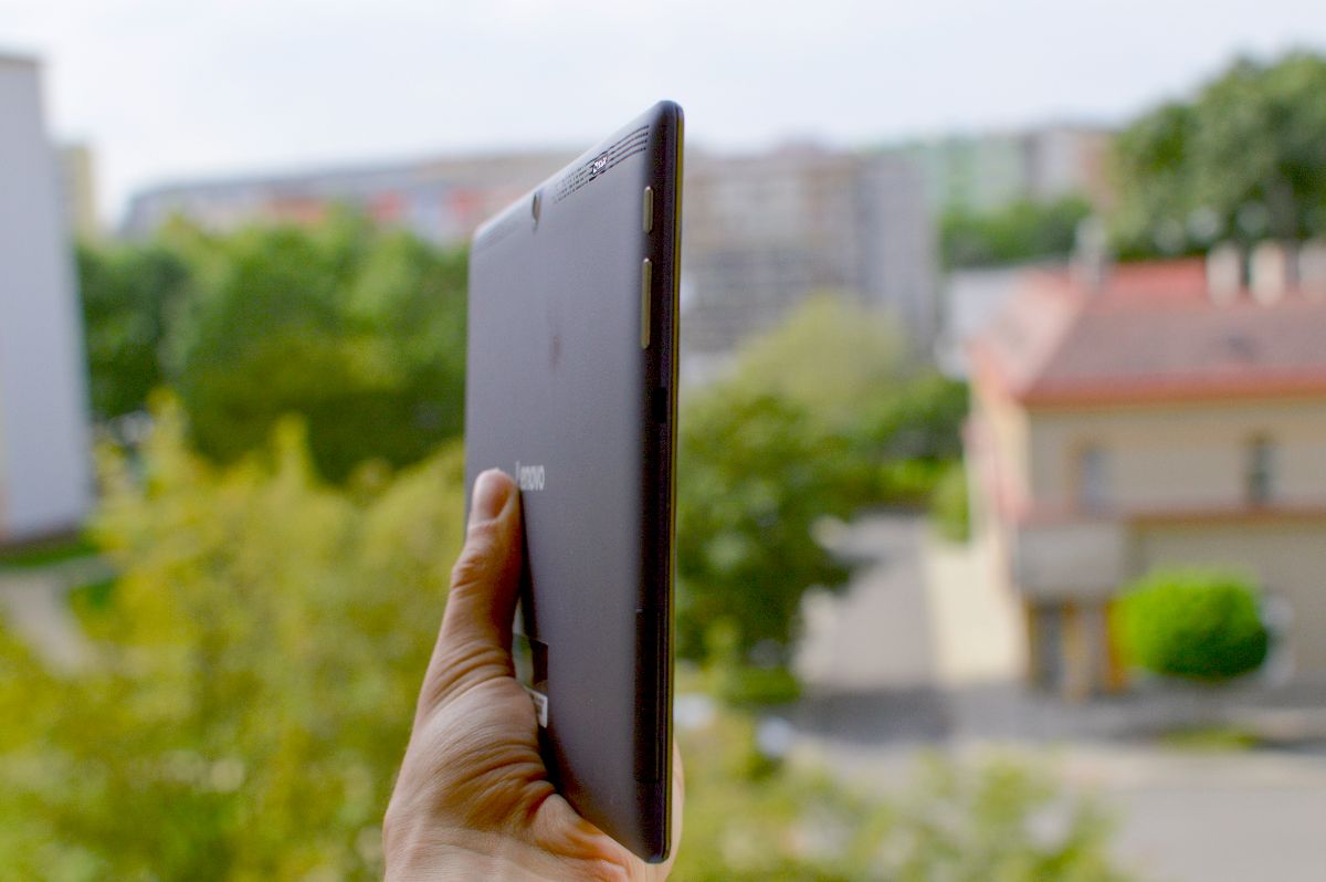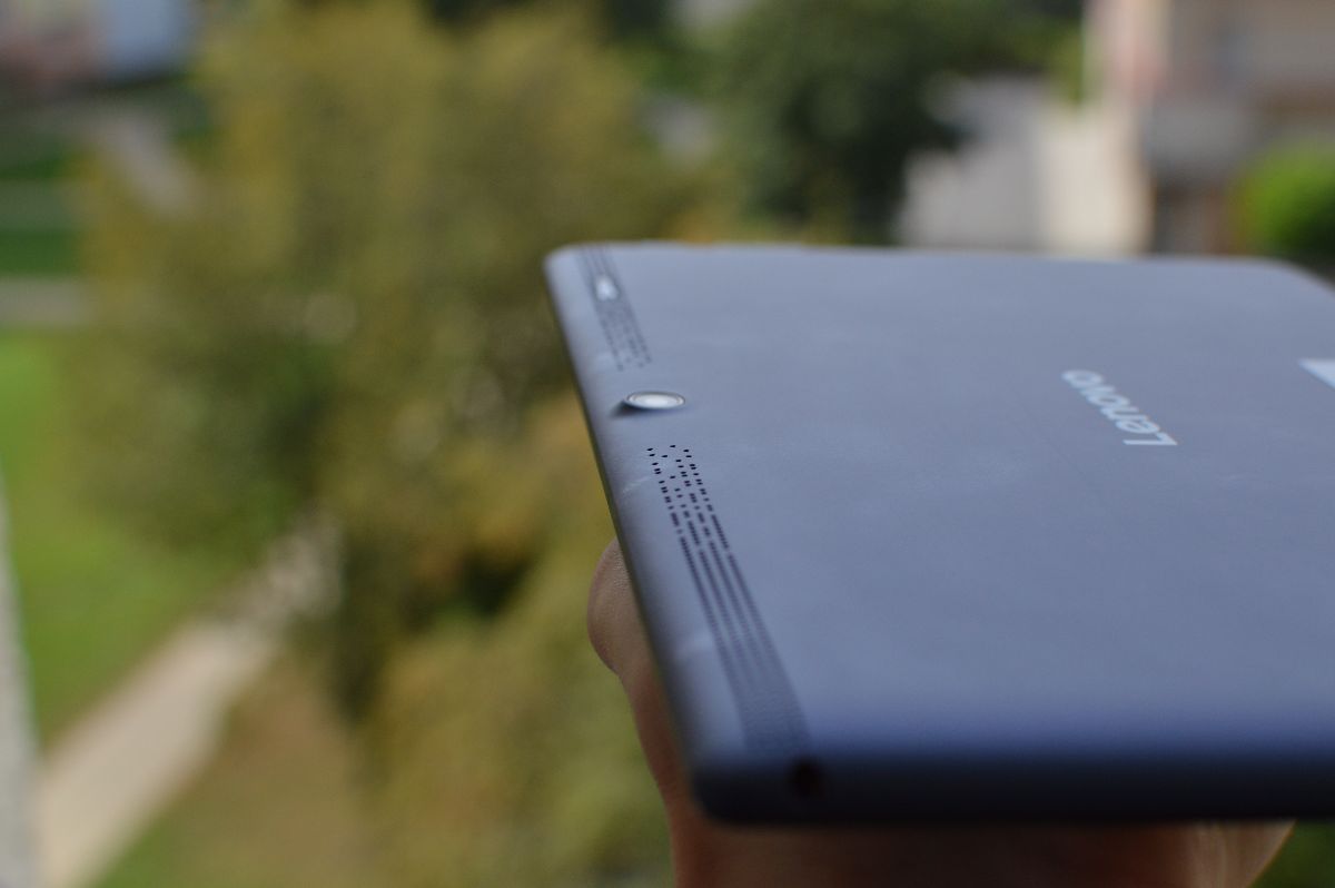 Zadní strana je o něco zajímavější. Ta je vybavena reproduktorem, který se táhne přes celou šířku vrchní části tabletu, do které je v přesném středu vsazen zadní fotoaparát. Děrování reproduktoru je po stranách vynecháváno, až zmizí „do ztracena“. Mimo fotoaparátu je do reproduktoru vsazeno i logo Dolby, neb reproduktory disponují technologií Dolby Atmos. Velkou nevýhodou je povrch, z jakého je zadní část tvořena, respektive barva na něm. Celá záda jsou plastová s matnou úpravou, na které bohužel zůstávají vidět otisky prstů a mastnota. Těchto nečistot se lze dobře zbavit pouze navlhčeným hadříkem.