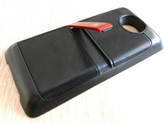 Jediný doplněk, který není označen jinou značkou než logem Moto. Jedná se o přídavný projektor, který vám umožní vytvořit si domácí kino, kdekoliv se vám zlíbí. Dokonce není ani potřeba absolutní tma v místnosti, stačí jen šero a obraz vypadá pěkně. Samozřejmě čím větší tma, tím hezčí a výraznější je obraz. Projektor obsahuje vlastní integrovanou baterii s kapacitou 1 100 mAh, která vydrží napájet projektor zhruba hodinu, ale po vybití baterie se bude projektor dále napájet z baterie telefonu a vy ani nic nepoznáte. Indikace baterie je opět jak ve stavové liště, tak na vnější straně doplňku. Baterie napájí pomocí integrovaného USB C konektoru.