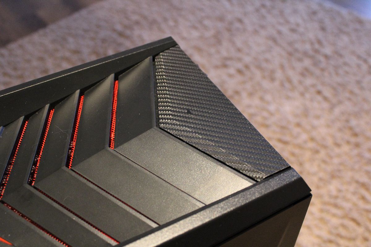 První věc, které si člověk hned všimne, je velká krabice a velká skříň, což by mělo pro znalé naznačit, že se bude jednat o stroj s velkým výkonem. Přeci jenom HW je výkonný a teplo je potřeba ze skříně dostat ven. A i zde platí čím větší, tím lepší, protože se tam vleze víc ventilátorů, ale o tom až později :) Design je stejný jako u Y700, nicméně na to, abych ho pochopil, musel jsem se vžít do osoby mladší 20 let. Důvod je jasný. Momentálně jasně preferuji střídmý a jednoduchý design, tedy vše, co vypadá jako ThinkPad – černá (nebo v jiné barvě, ale jednobarevná) hranatá krabice, jasně určená k jedinému účelu, a to fungovat. Ovšem pokud bych byl „teenager“, který má rád diskotéky a trochu agresivnější vzhled, tak by tohle bylo přesně to, co bych chtěl mít v pokojíku. Tedy ostré linie, imitace karbonu, červené podsvícení a průhledná bočnice, abych se mohl dívat na logo grafické karty a vnímat naplno podsvícené ventilátory. Ostatně fanoušci našeho blogu a značky Lenovo nebudou jistě překvapení, protože tenhle vzhled jde napříč celou modelovou řadou Y…