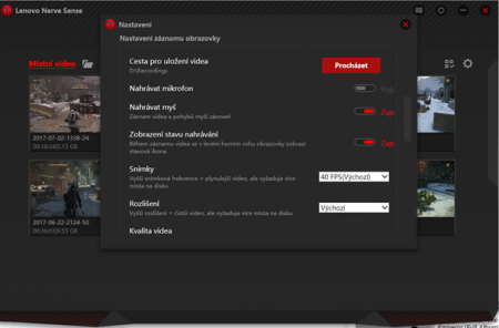 Na druhé záložce lze pak nalézt archiv nahraných videí, tak i nastavení záznamu obrazovky. V tomto menu lze nastavit nahrávání audia z mikrofonu, nahrávání pohybu myši a je zde i malá červená tečka symbolická pro video záznam. Kromě toho lze nastavit počet snímků za vteřinu (FPS) a kvalita videa.