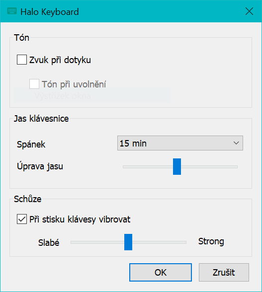Po restartu se vám na ploše Windows objeví zástupce nastavovací utility Halo klávesnice, která oproti starší verzi 1.0 nabídne češtinu (občas pokulhává…) a další možnosti nastavení, jako je zvuk při stisku i puštění klávesy a intenzita vibrací (zde doporučuji také aktualizovat onen ovladač vibrací, je nutné skrze správce zařízení ovladač vyhledat a aktualizovat pro oba vibrační motorky).
