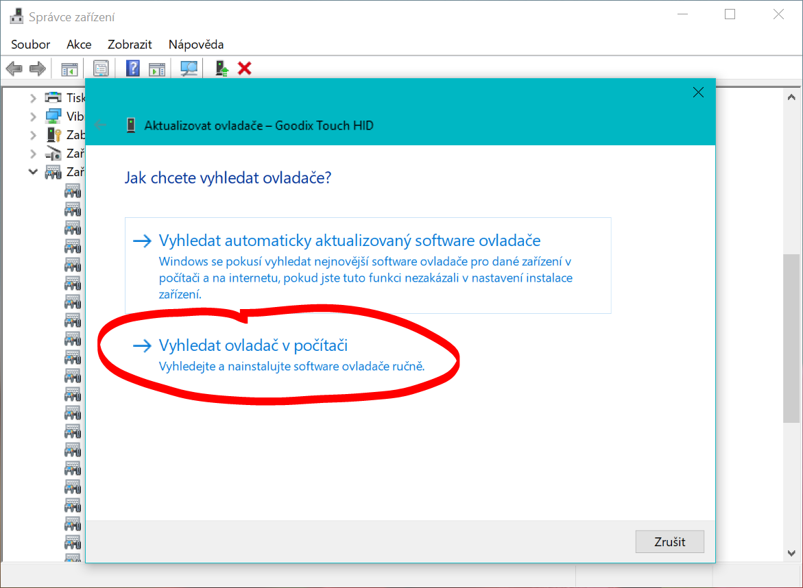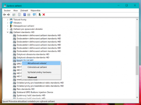 - Ve správci zařízení opět najděte Goodix Touch HID a pravým tlačítkem vyberte Aktualizovat ovladač.