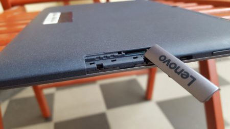 Slot na SD kartu se skrývá pod stříbrno-šedivou krytkou nesoucí logo Lenovo. Kryt se dá odklopit jednoduše a spojení působí dost bytelně, takže se člověk nemusí bát, že by ji hned tak odkroutil.