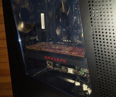 Nezbytnou součástí každého správného herního stroje je pak průhledná bočnice. Jelikož je zadní větrák podsvícený červenou barvou ve stylu série Legion je pohled po zapnutí nádherný. Scéně dominuje grafická karta NVidia GTX 1070 a nad ní masivní chlazení procesoru. Kromě průhledné bočnice je zde ještě další průduch pro chlazení. Ovšem zde mi na první pohled chybí prachové filtry.