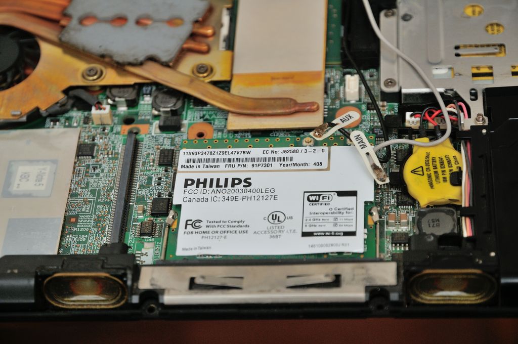 Do miniPCI slotu jsem chtěl osadit wifi kartu Philips (chipset Atheros AR5212, FRU 91P7301) sebranou z T42, protože na rozdíl od dodaného Intelu 2200BG podporuje pásmo 5GHz (802.11a) a pod Linuxem funguje se svobodným ovladačem ath5k. Rovněž jsem chtěl použít MDC kartu z T40p, která s 56k modemem kombinuje i Bluetooth (FRU 91P7297). Osazená MDC v mojí T43 měla pouze modem.