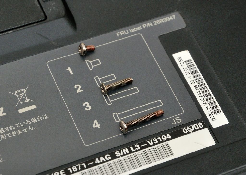 Velmi příjemná maličkost je u ThinkPadů této generace štítek zespod notebooku, na kterém jsou znázorněny použité druhy šroubků, přibližně v reálné velikosti a očíslované tak, aby bylo možné snadno spárovat správný šroubek s dírkou, do které patří. Mnoho lidí tuto věc zřejmě nezná nebo se neobtěžuje jí řídit, neboť jsem viděl několik T4x, u kterých někdo prošrouboval delší šroubek až do palmrestu. Tento jev jsem objevil i u jednoho z mých kusů. Zajímavé rovněž je, že šroubek velikosti 2 se na celém notebooku pravděpodobně vykytuje pouze v jednom exempláři (vedle infraportu, pravý roh při pohledu zespod). V žádném z mých vraků již samozřejmě nebyl. Řešení bylo snadné – vzít šroubek velikosti 3 a během minuty jej pilníkem trochu zkrátit. Rozměr jsem si přitom mohl snadno kontrolovat porovnáváním s obrysem na onom štítku.