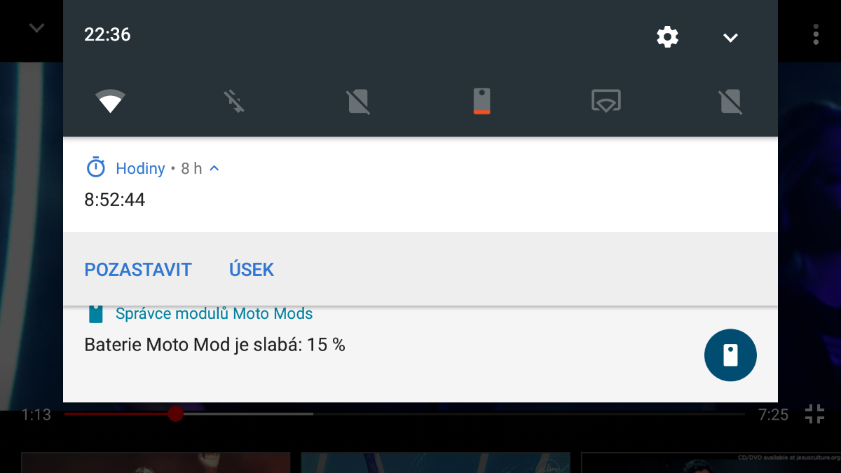 Poslední oblast, kterou bych rád zmínil, je výdrž baterie. Jak jsem již psal v parametrech, jedná se o 1100mAh akumulátor. Papírová výdrž jedné hodiny se ukázala v praxi jako docela pravdivá. Během hodiny dojde k vyčerpání vlastní baterie a projektor pak začne cucat baterii telefonu. Celkově tak promítání vydrží okolo dvou a půl hodiny bez pomoci powerbanky nebo nabíječky. Osobně se mi ještě osvědčil přehrávač VLC, který vypíná při promítání filmu přehrávání na displeji telefonu a tím šetří baterii.