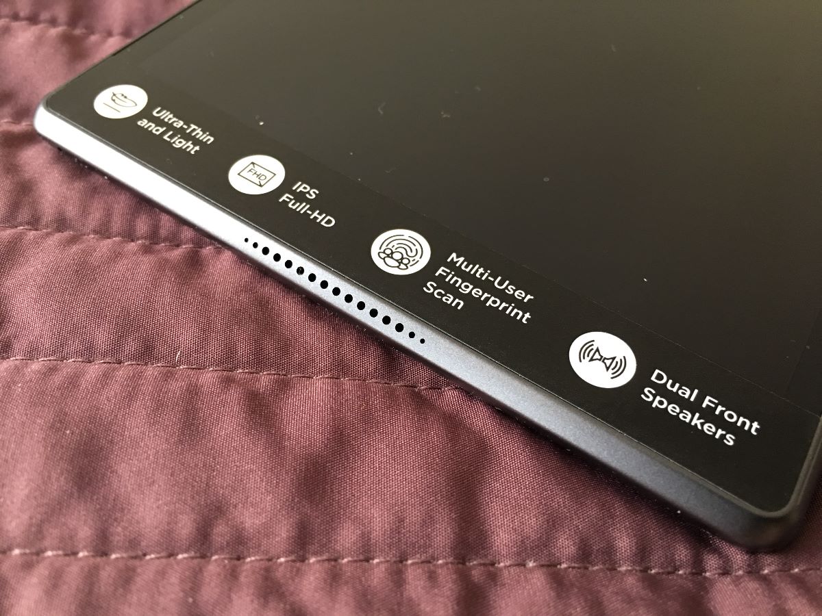 No a ohledně zvuku jsem ještě spokojenější. Tab 4 8 Plus nabízí stereo reproduktory. Potud nic nenormálního. Jenže namísto aby směřovaly dozadu a hrály všude jen ne k uživateli, jsou namířené dopředu, najdeme je za štěrbinami nad a pod displejem právě na oné zmíněné zkosené hraně rámu těla. K tomu jsou podpořené rozšířením Dolby včetně technologie Atmos. Výsledkem toho je hlasitý a prokreslený zvuk, který může tomuto malému 8″ tabletu závidět i kdejaký notebook! Se zvukem jsem byl skutečně velmi spokojen.