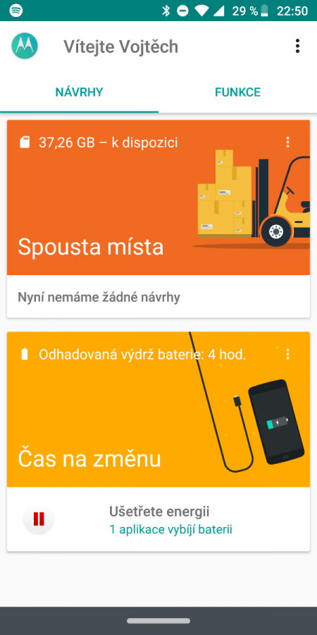 - Operační systém: Čistý Android 8.1 s vylepšeními Moto