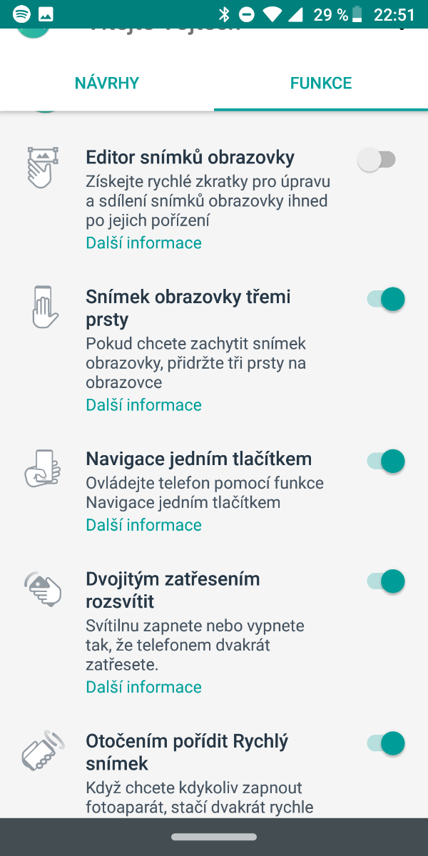 Povely Moto obsahují nastavení gest pro snadný screenshot přiložením tří prstů, editor snímků obrazovky (po vytvoření snímku obrazovky se otevře editor), dvojité zatřesení pro spuštění svítilny, otevření fotoaparátu po rychlém otočení telefonem, gesta pro zmenšení obrazovky a dále. Nejužitečnější funkcí je navigace jedním tlačítkem. Ta skryje tři tlačítka pod displejem do jednoho tenkého proužku. Pro krok zpět stačí proužkem posunout doleva, pro zobrazení spuštěných aplikací pak doprava. Díky tomu se na displej vleze více dat.