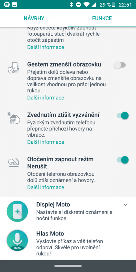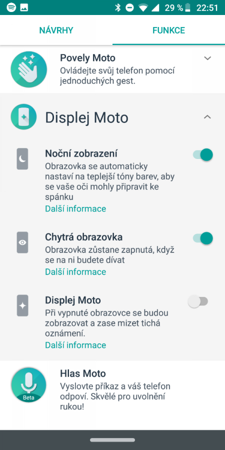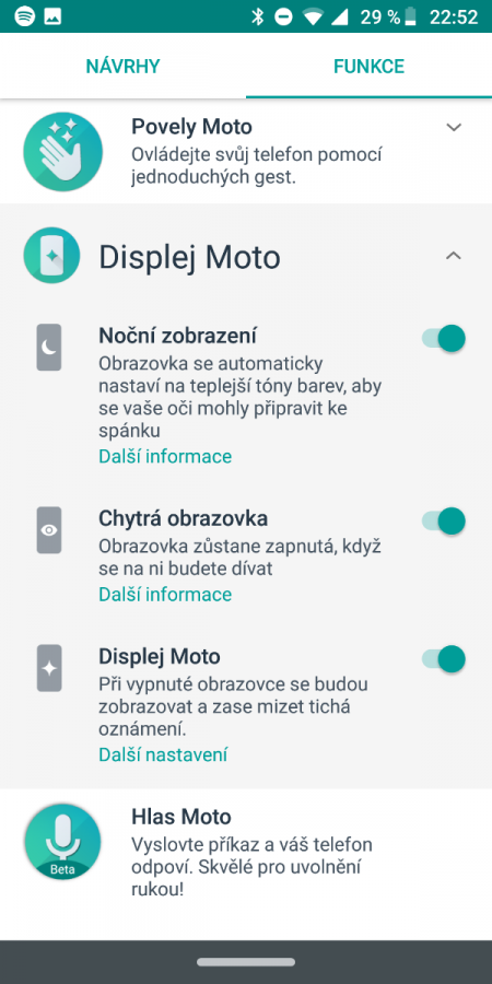 Moto displej skrývá nastavení pro noční zobrazení (redukce modrého světla), chytrou obrazovku, která pozná kdy se na telefon díváte a dle toho displej rozsvítí, a samotný Displej moto, který slouží jako náhrada za notifikační diodu. Stačí nad telefonem pohnout rukou, nebo jej vytáhnout z kapsy a na malé obrazovce se objeví notifikace. Pokud si však zapnete rozpoznávání obličejem, telefon se vám po chvilce odemkne, a tak si této funkce moc neužijete.