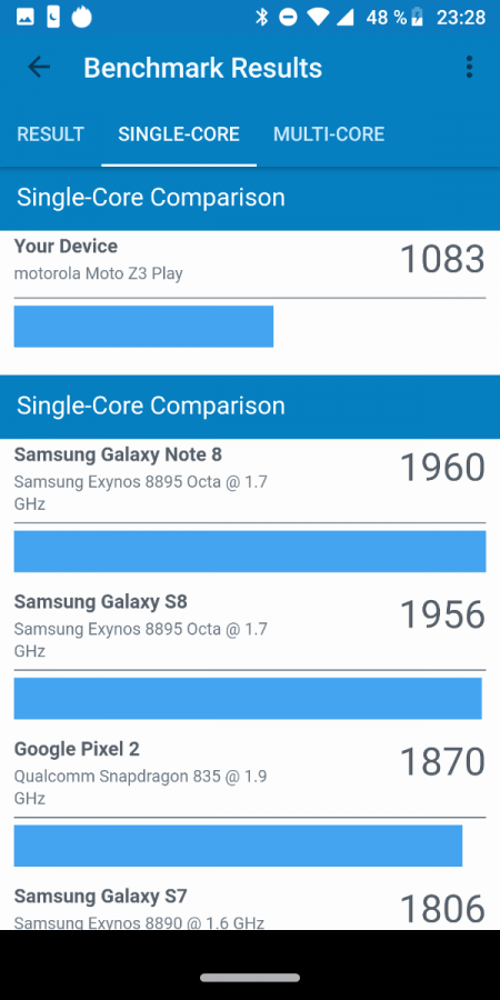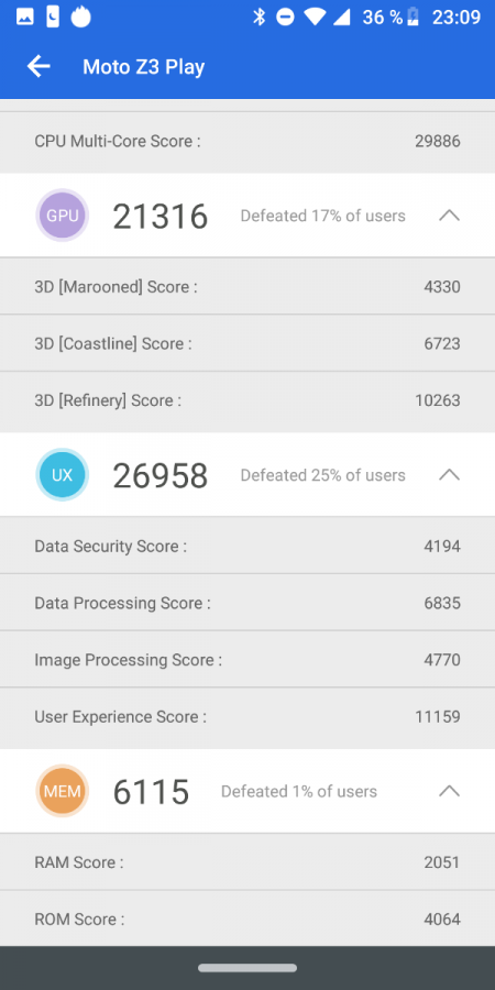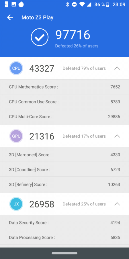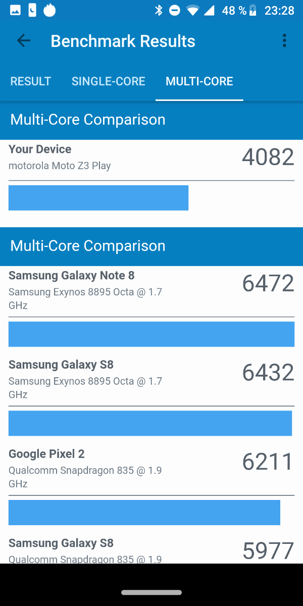 Srdcem nového Moto Z3 Play je SoC čip Qualcomm Snapdragon 636. Jedná se o relativně nový čip, který se řadí spíše do vyšší střední třídy. Nabízí osm jader Qualcomm Kryo 260 s maximálním taktem 1,8GHz. Procesoru pak sekunduje grafický čip Adreno 509, který se stará o vykreslení i té náročnější grafiky. SoC se příliš nezahřívá ani při náročnějších hrách, nebo náročnějších aplikacích a tak si myslím, že investice do vyšší řady je již celkem zbytečná. V telefonu se nachází také dostatečně velkých 4GB RAM a opomenout nesmíme ani 64GB interní paměť (dle některých zpráv by se měla objevit i levnější verze se 3GB RAM a 32GB úložištěm). S touto výbavou má však telefon výkonu na rozdávání. Ve screenshotech jsou výsledky benchmarků AnTuTu, 3DMark a Geekbench 4, které toto tvrzení potvrzují.