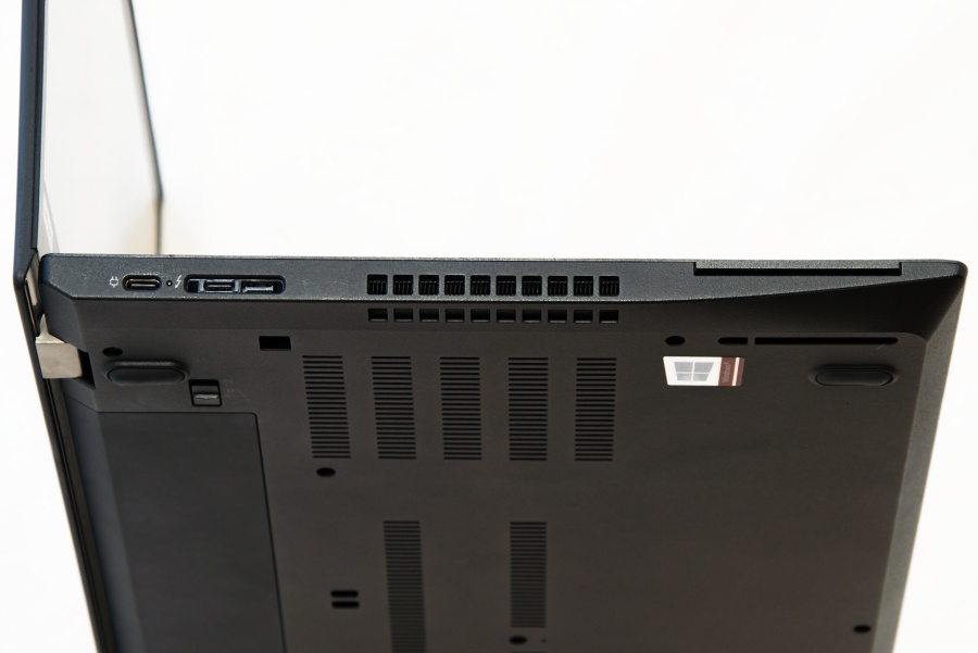 Na levé straně se nachází USB-C konektor s podporou Thunderbolt 3, který slouží zároveň pro napájení. Dále zde najdeme konektor pro připojení dokovací stanice, čímž lze získat další rozšiřující porty. V nabídce příslušenství Lenovo si určitě vybere každý. Pokud byste přemýšleli o pořízení docking station tak je zde mnoho variant s různými konektory jak pro monitory, tak pro periferie jako je třeba USB. Hned vedle otvorů pro odvod teplého vzduchu se nachází čtečka Smart Card.