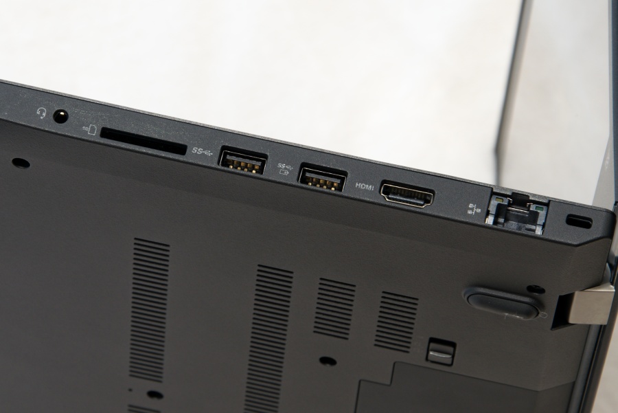 Pravá strana je pak osazena kombinovaným 3,5 mm audio jackem. Pokud chcete připojit zvlášť mikrofon a zvlášť sluchátka, je potřeba vše propojit takzvaným ypsilon kabelem. Pokud máte set, kde je vše v jednom konektoru, máte vyhráno. Dále je notebook osazen slotem pro SD karty, dvěma USB 3.1 porty, HDMI konektorem, a zdířkou RJ-45 pro konektor LAN sítě. Jako poslední se nachází na pravé straně otvor pro zámek Kensignton pro případ, že byste si notebook chtěli zajistit proti krádeži zamknutím třeba ke svému pracovnímu stolu.