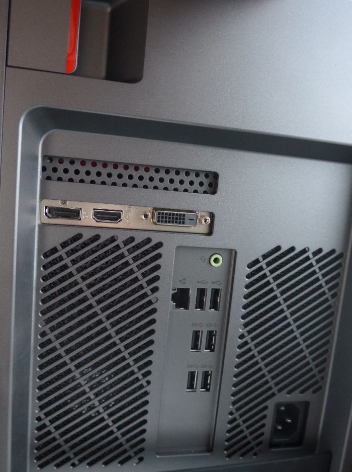 Na zadní straně toho – ve srovnání s běžným desktopem – moc není. Horizontální lišta konektorů patří grafice, vertikální základní desce. A vpravo dole je samozřejmě přípojka do elektřiny.