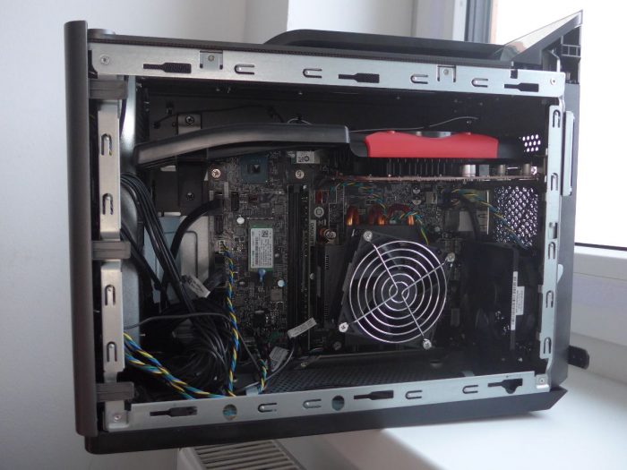V testované konfiguraci byla, jak už jsem napsal, osazena GTX 1050 Ti (na obrázku výše ta věc s červeným krytem). To je malá a základní karta, skříň ale obsahuje prostor pro podstatně větší grafiku, jak je vidět. Rozměrově malá grafika má v této konfiguraci za sebou černý štít, který slouží k správnému vedení vzduchu a tedy chlazení, ten je ovšem vyjímatelný. Takže pokud zakoupíte sestavu se základní grafikou a časem budete chtít přezbrojit na výkonnější model, uděláte to velice snadno i bez pokročilých znalostí. Stejně snadno doplníte paměti RAM DDR4. A stejně tak snadno vyměníte M.2 SSD disk, na kterém běží operační systém a který dokáže udělat divy pro zrychlení načítání her. O něco málo složitější pak bude výměna procesoru, který je pod vlastním chladičem (to je ten mírně našišato umístěný větrák). Tyto čtyři pro zvýšení výkonu nejdůležitější komponenty jsou tedy tak snadno upradovatelné, že to zvládne i dítě.