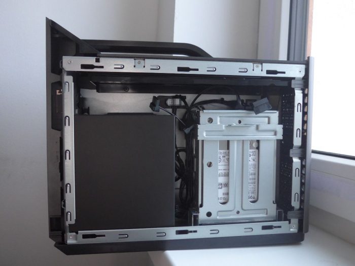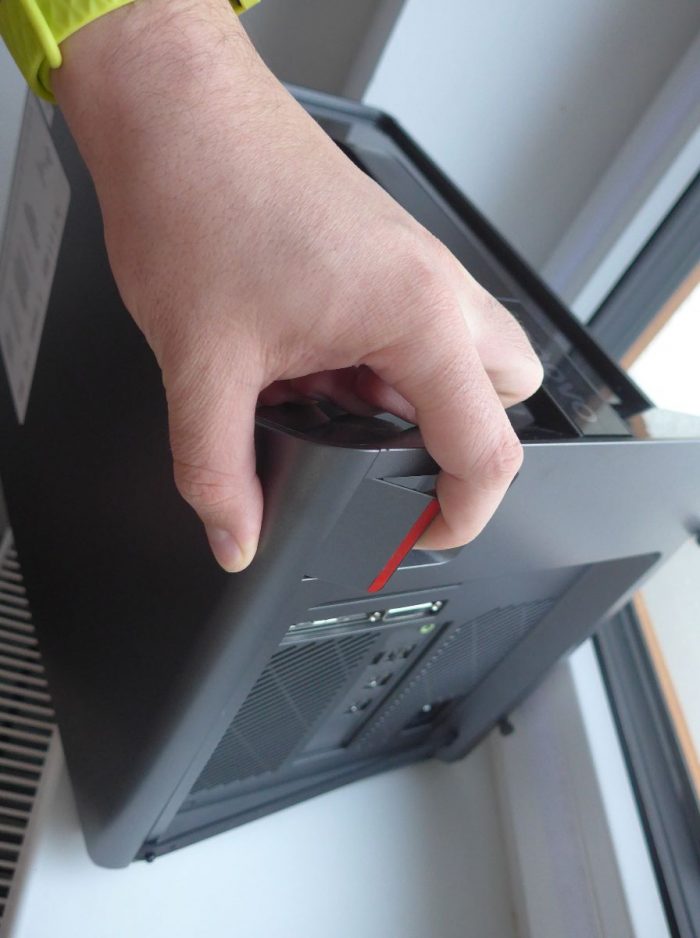 Skříň se dá otevírat ze dvou boků. Pod pravý bok se dostane aktivací velkého, rudě označeného tlačítka na zadní straně, zvládne to i malé dítě. Pod tímto krytem se skrývá základní deska s grafikou, paměťmi a procesorem.