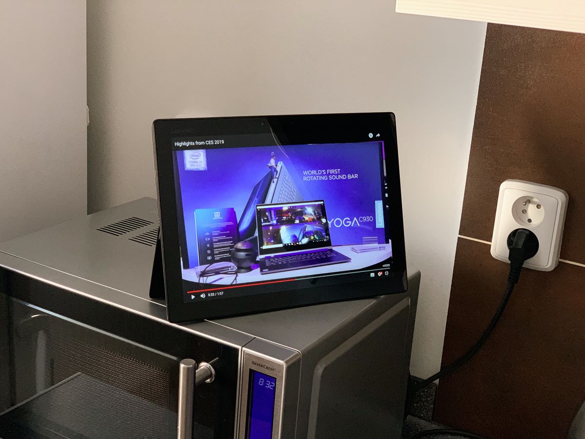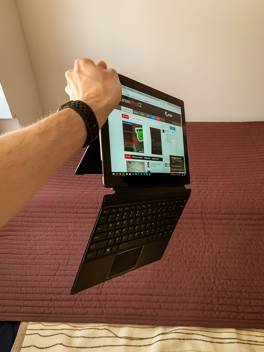 Protože je takové 2v1 velmi skladné (což platí i o poměrně velkém 12″ Miixu 720, vyberete-li menší model, ještě tím vše umocníte), můžete jej položit téměř kamkoliv. Doma v Čechách ho obvykle dávám na mikrovlnku (ke které se díky magnetům pro uchycení klávesnice navíc docela pevně „připne“, což popravdě není na škodu, stejně to funguje s pračkou), na kterou během vaření a mytí nádobí dobře vidím. Ale v mém zahraničím bytě tablet postavím do poličky nad dřez, kam se tak akorát vejde. Můj „mikrovlnkový scénář“ ještě s normálním notebookem dáte (a to i s poměrně velkým), ale do poličky bych žádný notebook (ani netbook) nenacpal. Ani nemluvě o tom, že bych ho pak neměl jak ovládat, na Miixu jen tapnu na obrazovku. Podobně u snídaně – nemám zrovna velký stůl, takže mi dost často přijde vhod režim bez fyzické klávesnice – jen tablet opřený o vyklopený stojánek, navíc nemusím rukama od jídla matlat po klávesnici nebo touchpadu. Milým překvapením pak je, že i v minimálním úhlu otevření je tablet docela dobře stabilní – čekal jsem, jestli nebude mít tendenci se převracet, ale zatím jsem na takový problém nenarazil.