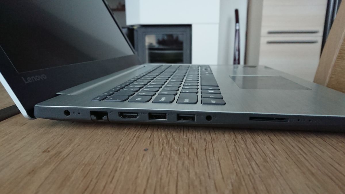 Když už jsme u připojování periferií, notebook disponuje průměrnou konektorovou výbavou – na levé straně nalezneme napájecí port (bohužel se jedná o proprietární konektor Lenovo, na USB-C zapomeňte), ethernet konektor (bohužel jen „stomegový“, nezvládá gigabit), HDMI, 1x USB 3.0, 1x USB 2.0, sluchátkový výstup a čtečku karet. Co mi přijde trošku nelogické, je umístění kontrolek vedle portů, pokud tedy potřebujete zjistit, zda máte počítač zapnutý nebo je dobitý, musíte se podívat na bok. Jako další minus pokládám absenci kontrolky činnosti disku.