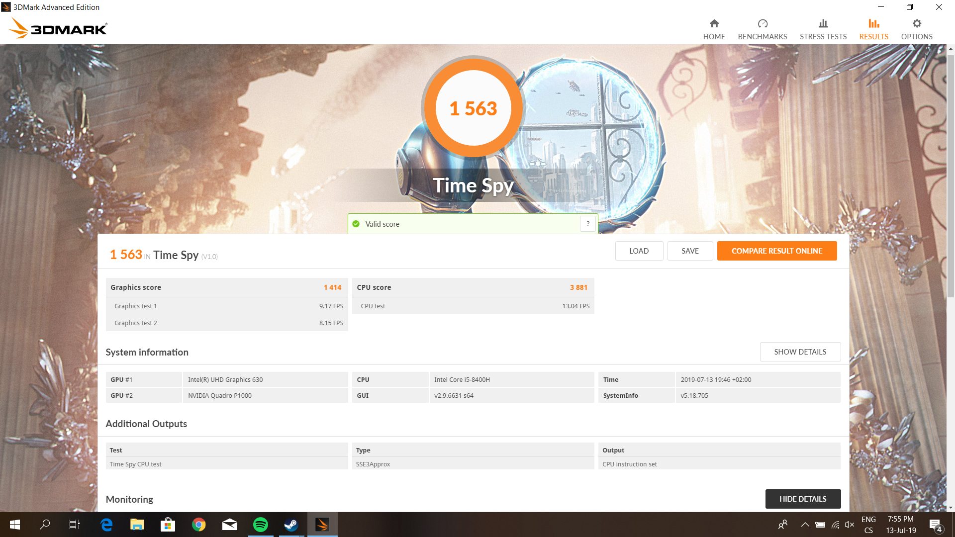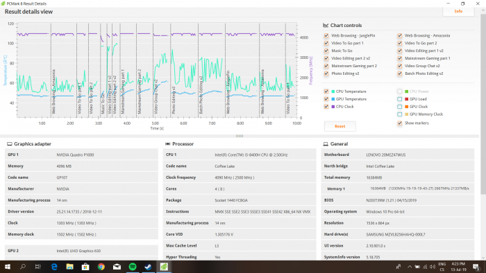 Pokud si budete pořizovat P1, tak to na 98 % bude kvůli jeho „vnitřnostem“. Grafika Nvidia Quadro P1000 není přímo určena na hraní, ale na různé výpočty, práci v CADech a renderování – to ale neznamená, že si na ní pár dobrých herních titulů nezahrajete. Ten výkon je prostě bombastický a ani já jsem nevyužil plný potenciál P1. Screenshoty z benchmarků vidíte níže, dovolím si ale jedno praktické srovnání – FullHD video při 50 FPS a bitratem 7,5 Mbps jsem na svém počítači s AMD A8-5600K & MSI R9 270X renderoval v Adobe Premiere Pro něco málo přes půl hodiny, tento notebook to zvládnul za poloviční čas (tj. 15 min) při běhu na baterii!
