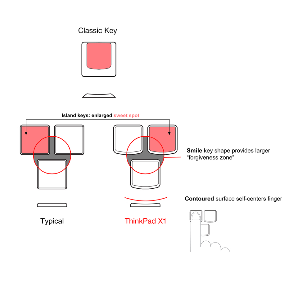 Lenovo používá od uvedení ostrůvkových klávesnic klávesy ve tvaru „úsměvu“ – znamená to, že klávesa při pohledu shora není pravidelný čtverec nebo obdélník, ale čtyřúhelník s vypouklou (konvexní) spodní stranou. Konvexní (prohnutý) je také samotný povrch klávesy. U ThinkPadů je prohnutí prominentnější než u IdeaPadů (i když rozdíly se se ztenčováním klávesnic stírají). Proč zrovna tenhle tvar? Je to jednoduché – jednak kopíruje tvar plošky na klasických klávesnicích a původních ThinkPad klávesnicích (kdybyste odstranili zkosení kolem plošky, dostanete tento tvar), ale hlavně snižuje překlepy (spodní zaoblení vám nedovolí opustit klávesu tak daleko, abyste stiskli zároveň jinou, prohnutí zase vede prst více do středu klávesy).