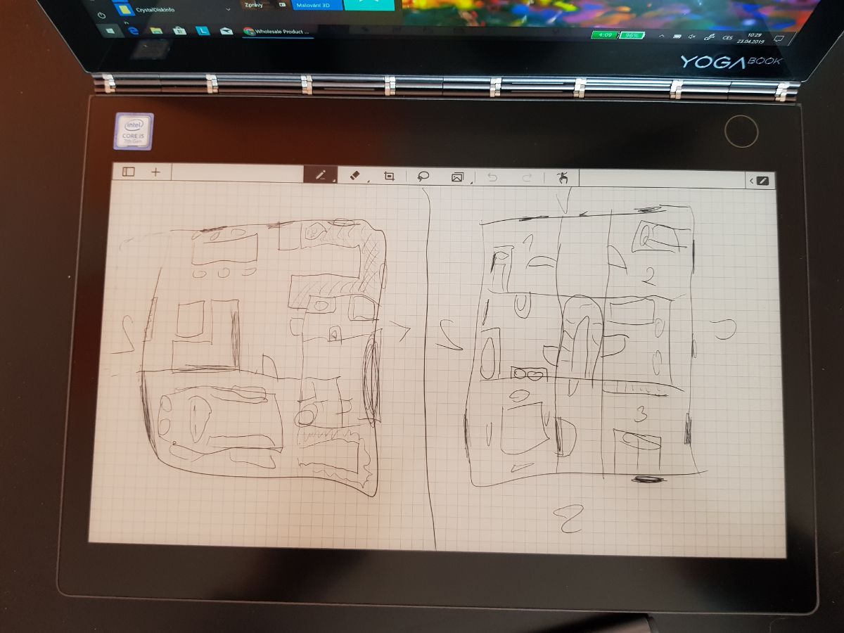 Jeden z nejdůležitějších prvků tohoto zařízení jsou bezpochyby jeho dva 10.8″ displeje. Pokud se budeme bavit o tom hlavním barevném, tak se jedná o IPS panel s poměrem stran 16:9 a rozlišením 2560 x 1600 bodů. Pozorovací úhly i barevné podání mi plně vyhovovalo a je na skvělé úrovni. To samé platilo i pro jas, jen na přímém slunci by to chtělo nějaký ten NIT navíc a raději matný displej. Také se díky lesklé úpravě dost upatlával. Samozřejmostí je i funkcionalita dotykového pera, které je aktivní a musí být napájeno AAA baterií, která je součástí balení. Pero má měnitelné hroty a podporuje až 4096 stupňů přítlaku. Jeno funkcionalita je také možná na spodním E-ink displeji. Ten má rozlišení FullHD a primárně nahrazuje klávesnici. V nutném případě pak supluje čtečku elektronických knih uložených na disku, nebo návrhové plátno. Je zde i možnost kopírovat obraz na hlavním displeji a doplnit ho o případný náčrtek. Hlavní nevýhoda tohoto E-inku je v absenci podsvícení. Jak v režimu klávesnice, tak i v režimu čtečky bych jej dost uvítal. Bohužel je zde jen možnost nastavení jasu, které ale v noci podsvit nenahradí. Rychlost odezvy také není úplně dokonalá.