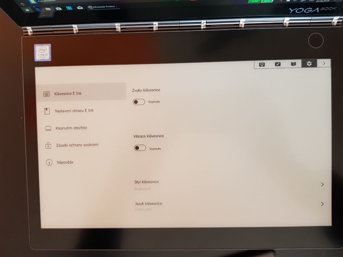 Ta úzce souvisí s minulými odstavci. Jedná se totiž o mód, který má E-Ink displej. Jak jsem psal, není podsvícená, a v noci se musíte spoléhat na osvícením vrchním displejem. Layout klávesnice se dá měnit v nastavení, takže může suplovat vice jazyků. Nutno ale dodat, že český byl v nabídce až po aktualizaci firmwaru. Na klávesnici si musíte opravdu zvykat, protože se nejedná o klasické mačkatelné klávesy tak musíte spoléhat na oči nebo odhad. V nastavení si můžete zapnout funkci zvukové a hmatové odezvy, a to vícestupňové jak vibrací, tak zvuku. Hmat vám to ale bohužel nenahradí. Také si můžete vybrat ze tří stylů kláves. Jediné hardwarová tlačítka na přístroji jsou na pravé straně, kde je ovladač hlasitosti a vypínací tlačítko. Čtečka otisku prstu je umístěna v pravém horním rohu a fungovala bez problémů. Největší problém jsem ale měl s touchpadem. Ten, aby uvolnil více místa na malé ploše klávesnici, byl proveden malým oválem pod mezerníkem, kterého se musíte dotknout aby se zvětšil přes celý mezerník. Ten zas nemůžete použít, dokud se nedotknete mimo zvětšený touchpad, který se opět změní v ovál pod mezerníkem a mezerník můžete opět využívat. Chce to opravdu zvyk a řešení je jen kompromisní. Za celou dobu jsem si na psaní nezvykl a bylo pro mne nepohodlné Na druhou stranu je to ústupek modernějším technologiím a někomu to tak vadit nemusí. Jde z kterého úhlu se na zařízení díváte.