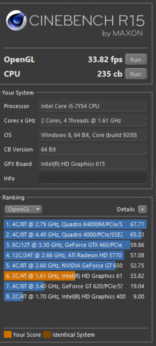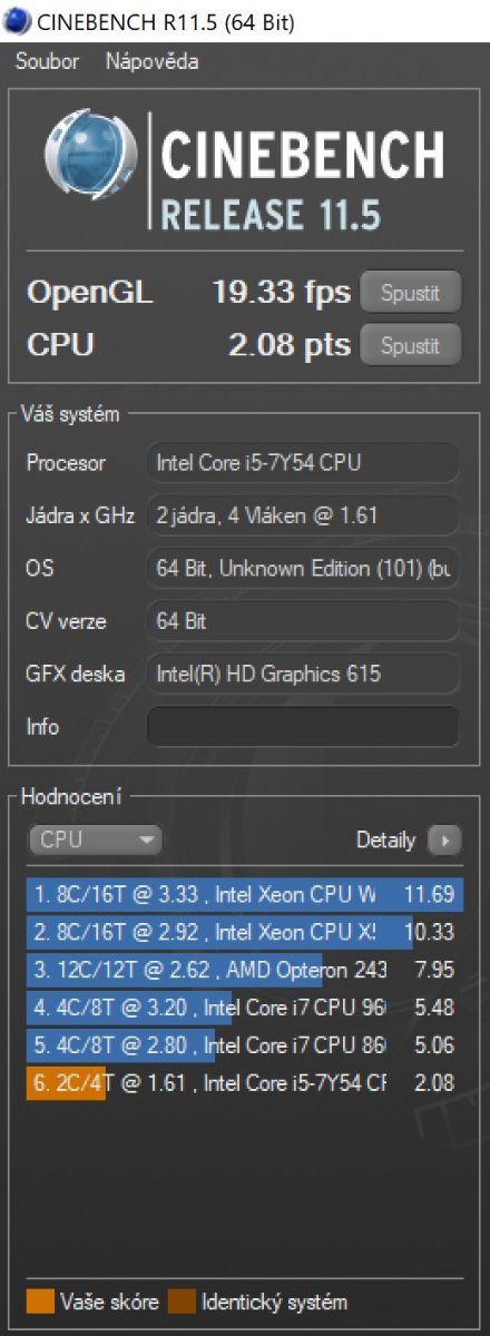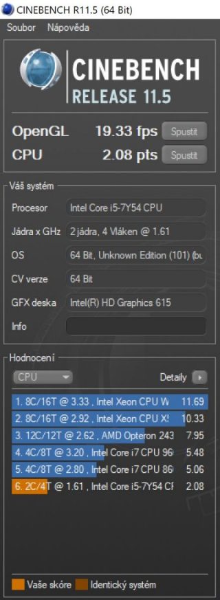 U výkonu si musíme uvědomit, že i když se jedná o plnohodnotný notebook na platformě Intel Core i5, jde o jeho nejúspornější variantu Y. To na jedné straně znamená pasivní chlazení, ale na druhé omezení frekvence a výkonu. Testovaná varianta měla přesný typ i5-7Y54. Ten má dvě fyzická jádra a základní frekvenci 1.2GHz s pomocí Turbo Boostu dosahují až 3.2GHz. Což není ani moc, ani málo. Na běžnou práci bohatě postačuje. S nějakým složitým renderováním by již problémy byly.