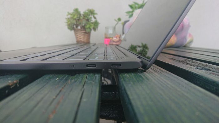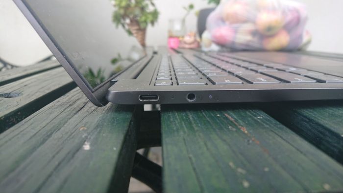 Chcete si k notebooku připojit „flashku“ nebo třeba externí displej? Můžete, nikdo vám v tom nebrání, jen mějte na paměti, že nic jiného než tři USB-C a audio výstup na tomto notebooku nenajdete. Přesněji se jednalo o dvě USB-C druhé generace na pravé straně, na straně levé najdete USB-C první generace a zmíněný 3,5mm jack. Názor na to, zda je toto redukování konektorů dobré nebo ne, si udělejte sami. Kromě zvukového výstupu a USB-C si na zmíněné levé straně své místo našly i stavové diody (zapnutí, baterie). Přišlo mi zajímavé, že nízký stav nabití signalizovala kontrolka napájení a to tak, že se jednoduše rozsvítila červeně. Podle mě by stačilo, aby se tam nacházela jen jedna, a to dioda baterky. Kontrolka zapnutí, která se taky uměla zbarvit, byla integrovaná i v napájecím tlačítku. A protože notebook není určen pro firemní sféru, tak mi zde ani zas tak nechyběla dioda činnosti pevného disku.