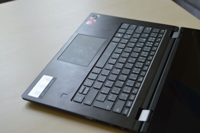 Klávesnice s nižším zdvihem je standardně šestiřadá. Nižší zdvih je u konvertibilních zařízení pochopitelný – vyšší zdvih by vadil při práci v režimu tablet. I přes to se na klávesnici píše dobře. Přesně pod klávesnicí se nachází relativně velký touchpad. Klávesnice v testovaném kusu je vybavena podsvícením se dvěma úrovněmi intenzity podsvícení.