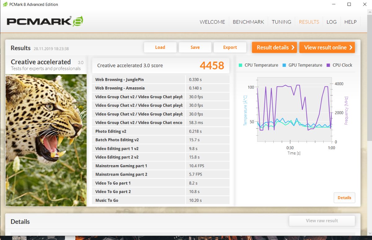 Opravdu mě potěšil rychlý start počítače. BIOS při startu přeskakoval některé POST testy a díky kombinaci s rychlým SSD to bylo opravdu bleskové. Hardwarová výbava mě v práci nijak neomezovala, na nic jsem nemusel dlouho čekat a počítač se nepřehříval. V benchmarku sice teplota procesoru vystoupala až na 90°C, notebook se ale zvládl uchladit (i když trochu hlučněji). Při běžné práci se ventilátor spouštěl jen, když jsem měl počítač položený na klíně (nebylo dostatečné větrání zespodu).