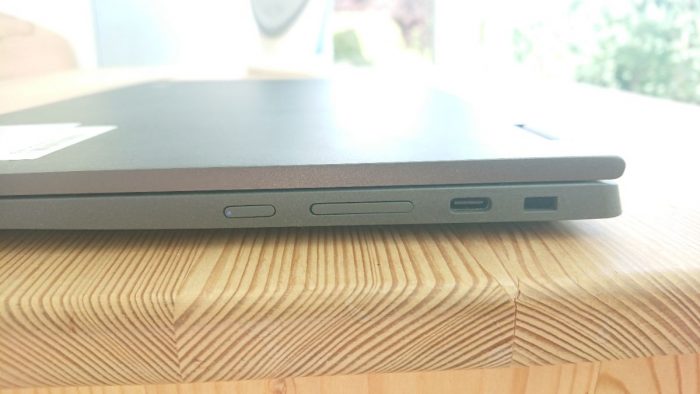 Na straně pravé se nachází zámek Kensington, 2× USB-C (jedno s podporou DisplayPortu) a něco, co vypadá u mobilů jako šuplíček na SIM a SD kartu. Co by to tedy mohlo být zde? Pokud si myslíte, že to bude WWAN modul, jste na omylu. Jedná se totiž o tři tlačítka – jedno kolébkové (na snižování a zvyšování hlasitosti) a to samostatné je tlačítko napájení.