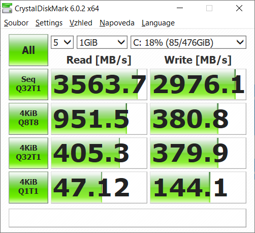 Úložištěm testovaného kusu je rychlé NVMe SSD Samsung PM981, což už je taková OEM klasika. Disk je osazený v M.2 slotu, a je možné jej případně vyměnit za jiný. S kapacitou 512 GB poskytuje dostatek místa pro dokumenty i některé větší programy. Jde o velmi rychlý a léty prověřený disk, který poslouží i náročnějším zákazníkům, neboť disponuje slušnými rychlostmi i v sekvenčním zápisu/čtení.