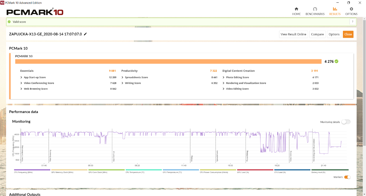Notebook tedy krátkodobě dovolí procesoru dosáhnout vysokých frekvencích, po několika sekundách ale takty padají směrem k základní frekvenci. To umožňuje rychlou odezvu např. při načítání webových stránek či spouštění programů, kontinuální vysoký výkon ale od ThinkPadu X13 Gen 1 nečekejte. Testy zátěže jsem zkoušel i při běhu na baterii. Takty notebook držel přesně tak, jak se sluší a patří, nezaznamenal jsem při běhu na baterii throttling.